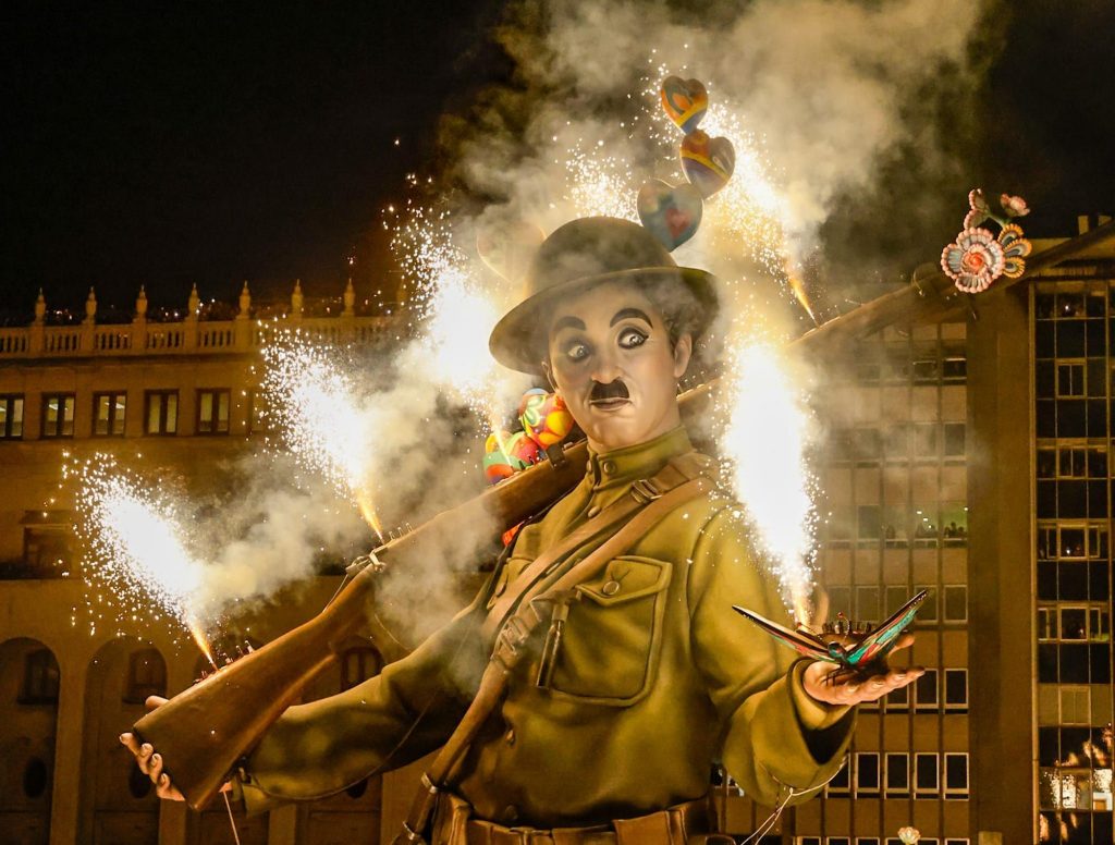 En el presente año 2026 han plantado las populares fallas de Valencia, una de ellas dedicada a nuestro bien amado Charlie Chaplin, el gran Charlot, reivindicando la Paz Mundial ante el belicismo del presidente Donald Trump. Debajo está la palabra HOPE que quiere decir ESPERANZA en inglés. La falla es preciosa con una imagen que rememora el corto Armas al hombro (1918), uno de los mejores de su gloriosa filmografía.
