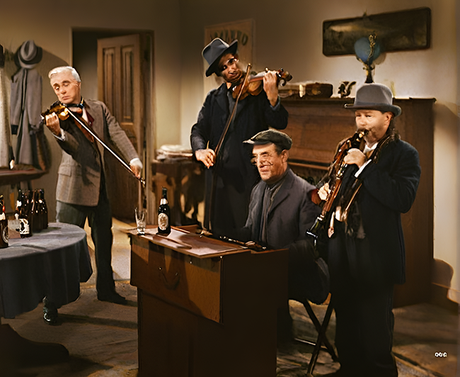 Snub Pollard toca el piano mientras Sir Charles Chaplin toca el violín en Candilejas.