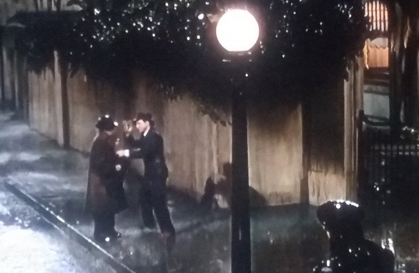 Gene Kelly regala el paraguas a Snub Pollard en Cantando bajo la lluvia.