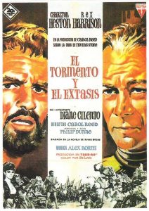 EL TORMENTO Y EL ÉXTASIS. Título original: The Agony and the Ecstasy. Año: 1965. País: Estados Unidos. Dirección: Carol Reed. Reparto: Charlton Heston (Miguel Ángel Buonarrotti), Rex Harrison (Papa Julio II), Diane Cilento (Contessina de Médici), Alberto Lupo (Duque de Urbino), Adolfo Celi (Giovanni de Medici), Venantino Venantini (Paris de Grassis), John Stacy (Sangallo), Fausto Tozzi (Capataz), Maxine Audley (Mujer), Harry Andrews (Bramante), Tomás Milián (Rafael Sanzio). Guion: Philip Dunne. Novela: Irving Stone. Música: Alex North. Fotografía: Leon Shamroy. 20th Century Fox. Duración: 139 minutos.