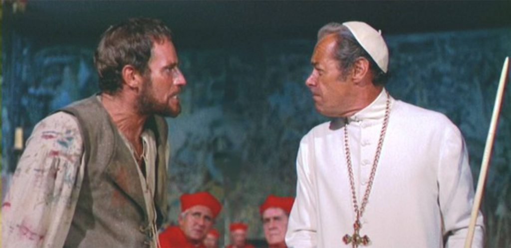Dirigida por el británico Carol Reed (Londres, 30 de diciembre de 1906 – ibídem, 25 de abril de 1976) , autor de El tercer hombre (1949) y Oliver (1968). Desgraciadamente El tormento y el éxtasis pinchó en taquilla y se olvidó con el tiempo. Pero vista ahora comprobamos que es una película que ha sobrevivido al paso del tiempo. Tiene sus puntos de reflexión. Me gusta mucho la disputa con el pintor Rafael (el cubano Tomás Milian antes de centrarse en los westerns italianos) . Miguel Angel defiende la libertad del artista, el respeto que merece, y Rafael en cambio prefiere caer en el servilismo ante los poderosos que financian sus obras.