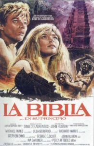 LA BIBLIA… EN SU PRINCIPIO (1966). Título original: The Bible: In the Beginning… Año: 1966. País: Estados Unidos. Dirección: John Huston. Reparto: John Huston (narrador/Dios/Noé), Franco Nero (Abel), George C. Scott (Abraham), Michael Parks (Adán), Zoe Sallis (Agar), Peter O’Toole (los tres ángeles), Richard Harris (Caín), Angelo Boscariol (Cam), Giovanni Di Benedetto (el criado de Nemrod), Gabriella Pallotta (la esposa de Cam), Rossana De Rocco (la esposa de Jafet), Eleonora Rossi Drago (la esposa de Lot), Claudie Lange (la esposa de Nemrod), Pupella Maggio (la esposa de Noé), Anna Orso (la esposa de Sem), Ulla Bergryd (Eva), Alberto Lucantoni (Isaac), Luciano Conversi (Ismael), Eric Leutzinger (Jafet), Gabriele Ferzetti (Lot), Stephen Boyd (Nemrod), Ava Gardner (Sara), Peter Heinze (Sem), Flavio Bennati (la serpiente). Guion: Vittorio Bonicelli, Cristopher Fry, Jonathan Griffin, Ivo Perilli. Basado en el Genesis. Música: Toshiro Mayuzumi. Fotografía: Giuseppe Rotunno. Coproducción Estados Unidos-Italia; 20th Century Fox, Dino de Laurentiis Cinematographica, Seven Arts Pictures. Productor: Dino de Laurentiis. Distribuidora: 20th Century Fox. Duración: 174 minutos.